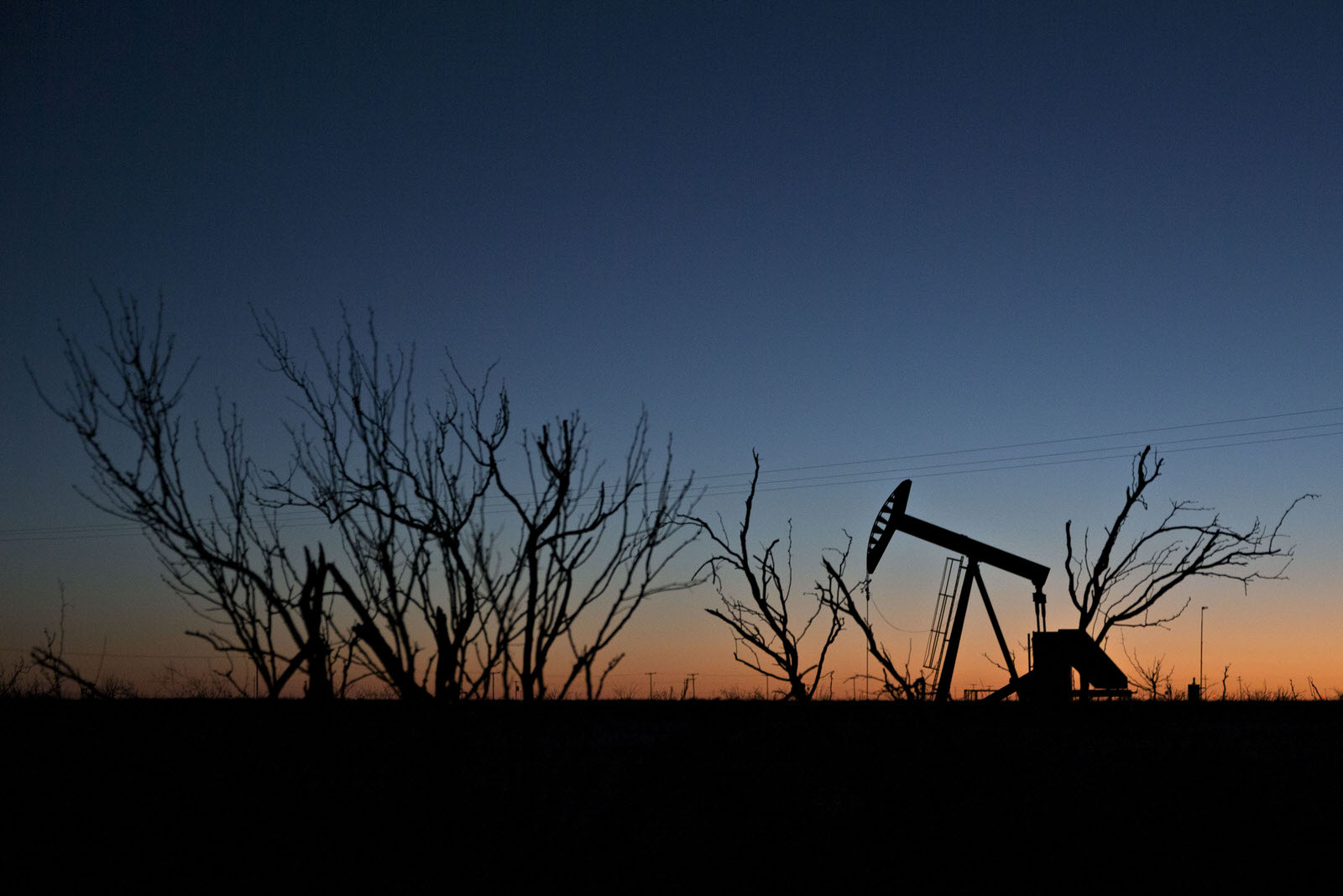 The silhouette of a pumpjack is seen at dusk in the Permian Basin